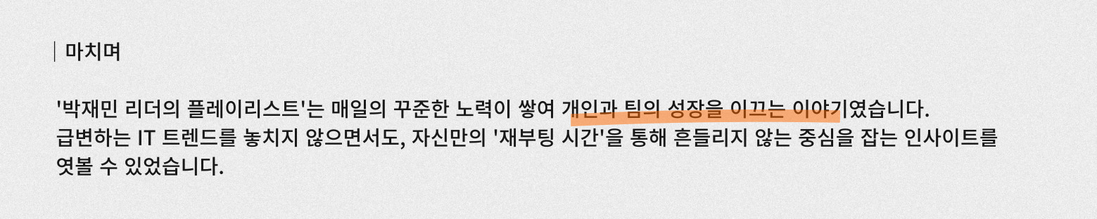 이 글을 읽는 미래의 동료에게 '이 플레이리스트는 꼭 추가해보세요!' 하고 추천하고 싶은 단 하나의 콘텐츠가 있다면요?